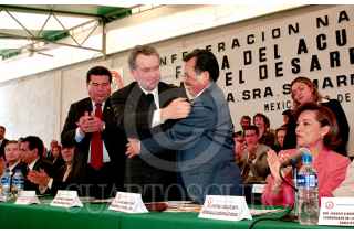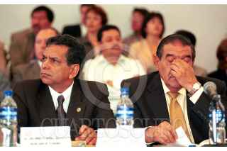 Fidel Herrera y Javier Usabiaga escuchan en discurso del dirigente de la CNC, Heladio Ramírez antes de la Firma del Acuerdo Político para el Desarrollo Nacional. FOTO: Victoria Valtierra/CUARTOSCURO.COM