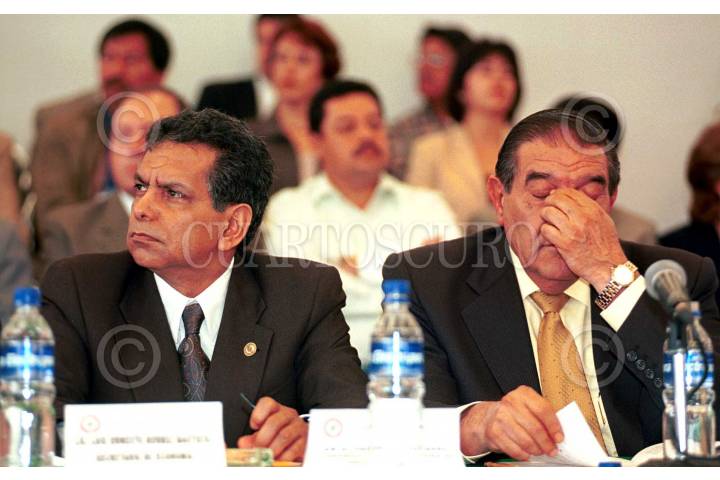 Fidel Herrera y Javier Usabiaga escuchan en discurso del dirigente de la CNC, Heladio Ramírez antes de la Firma del Acuerdo Político para el Desarrollo Nacional. FOTO: Victoria Valtierra/CUARTOSCURO.COM