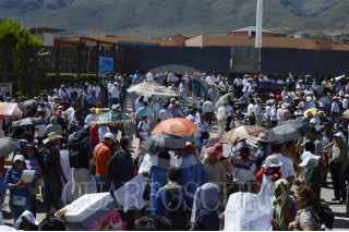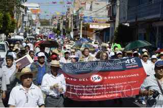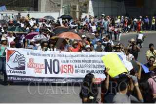 CHILPANCINGO, GUERRERO, 11FEBRERO2016.-Trabajadores del Sindicato de Trabajadores Académicos de la Universidad Autónoma de Guerrero (STAUAG) y del Sindicato de Trabajadores Técnicos, Administrativos y de Intendencia al servicio de la UAGro, marcharon para protestar por la aplicación del cobreo del ISR a las prestaciones y exigieron la aparición con vida de los 43 jóvenes desaparecidos en Iguala. Los inconformes marcharon de la Alameda Granados Maldonado, ubicada en avenida Juárez, hacia el Palacio de Gobierno e hicieron una parada en el Congreso local. FOTO: JOSÉ I. HERNÁNDEZ /CUARTOSCURO.COM