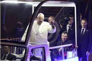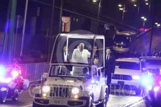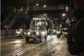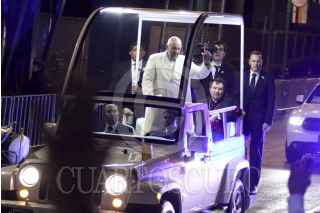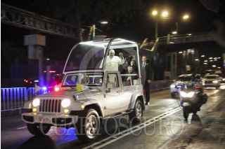 CIUDAD DE MÉXICO, 12FEBRERO2016.- El Papa Francisco arribó la noche de hoy a la Ciudad de México procedente de Cuba. El máximo jerarca de la iglesia católica recorrió las avenidas Santos Dumont, Fuerza Aérea, Hangares, Churubusco e Insurgentes abordo del papamóvil. FOTO: SAÚL LÓPEZ /CUARTOSCURO.COM