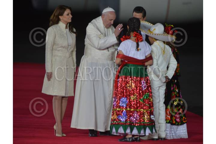CIUDAD DE MÉXICO, 12FEBRERO2016.- La llegada del Papa Francisco contó con las presencia de cientos de invitados especiales entre los que se encontraba Porfirio Muñoz Ledo, político de izquierda. El sumo pontífice arriba la noche de hoy al Hangar Presidencial en donde fue recibido por el Presidente Enrique Peña Nieto y su esposa Angélica Rivera. En la imagen Angélica Rivera y Enrique Peña Nieto acompañan al sumo pontífice. FOTO: GALO CAÑAS /CUARTOSCURO.COM