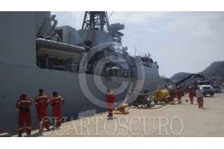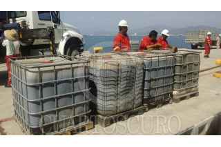 COLIMA, COLIMA, 13FEBRERO2016.- La Procuraduría Federal de Protección al Ambiente (PROFEPA) da seguimiento al derrame de aceites usados en aguas marinas de Manzanillo, generado por una cuestión técnica en donde el trasvasar el combustóleo la empresa “Simpsa Amarradores y Lanchaje” de una barcaza a la embarcación canadiense "Vancouver", el equipo de bombeo no se paró a tiempo y propició la contingencia ambiental. Hasta el momento se han recuperado 8 bidones llenos con una capacidad de mil litros cada uno, mezclados de aceites usados, aguas oleosas y agua de mar. FOTO: PROFEPA /CUARTOSCURO.COM