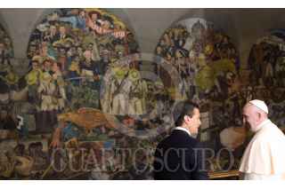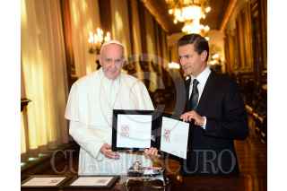 CIUDAD DE MÉXICO, 13FEBRERO2016.- En el marco de la Ceremonia Oficial de Bienvenida al Papa Francisco, el Presidente Enrique Peña Nieto canceló el Timbre Postal Conmemorativo a la “Visita de Su Santidad, el Papa Francisco” a México. FOTO: CUARTOSCURO.COM