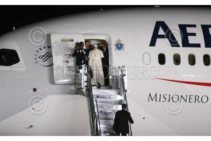 CIUDAD JUAREZ, CHIHUAHUA, 17FEBRERO2016.- El papa Francisco se despidió de los mexicanos en el aeropuerto internacional Abraham González, tras concluir la misa que ofició en la frontera donde se reunió con migrantes y que fue la última actividad pública como parte de su gira pastoral. El sumó pontífice fue despedido por el Presidente de México Enrique Peña Nieto así como integrantes del gabinete federal, cardenales y obispos. Al término de la ceremonia protocolaria de despedida abordo el avión "Misionero de Paz" que lo llevará al Vaticano. En la imagen una mujer se salto el cerco de seguridad y abrazo y beso al Papa Francisco. FOTO: SAÚL LÓPEZ /CUARTOSCURO.COM
