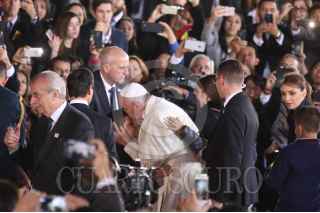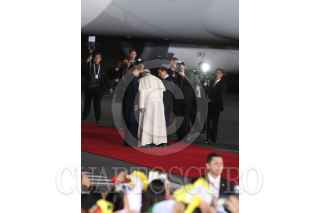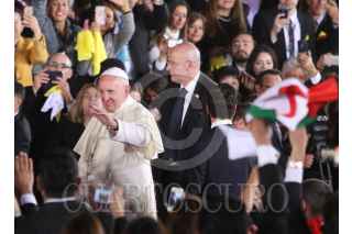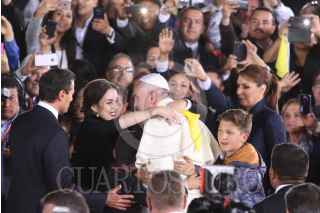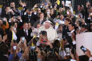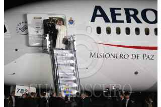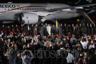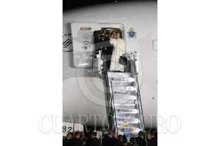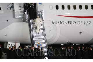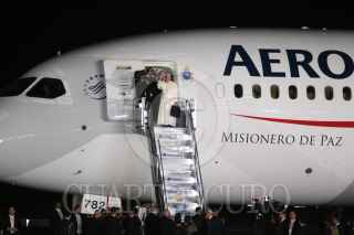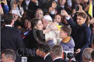 CIUDAD JUAREZ, CHIHUAHUA, 17FEBRERO2016.- El papa Francisco se despidió de los mexicanos en el aeropuerto internacional Abraham González, tras concluir la misa que ofició en la frontera donde se reunió con migrantes y que fue la última actividad pública como parte de su gira pastoral. El sumó pontífice fue despedido por el Presidente de México Enrique Peña Nieto así como integrantes del gabinete federal, cardenales y obispos. Al término de la ceremonia protocolaria de despedida abordo el avión "Misionero de Paz" que lo llevará al Vaticano. En la imagen una mujer se salto el cerco de seguridad y abrazo y beso al Papa Francisco. FOTO: SAÚL LÓPEZ /CUARTOSCURO.COM