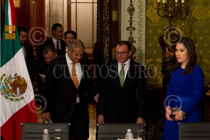 CIUDAD DE MÉXICO, 18FEBRERO2016.- Diana Bernal Ladrón de Guevara, titular de la Procuraduría de la Defensa del Contribuyente, Luis Robles Miaja, presidente de la Asociación de Bancos de México, y Luis Videgaray, secretario de Hacienda y Crédito Público, firmaron las bases de colaboración para inhibir la suplantación de identidad a través del sistema financiero en México, que se realizó en el Palacio Nacional. FOTO: MOISÉS PABLO /CUARTOSCURO.COM