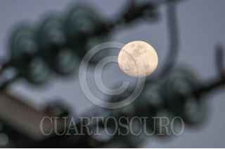 CIUDAD DE MÉXICO, 19FEBRERO2016.- Vista de la luna enmarcada por unos cables de alta tensión, la cual se encuentra entre el cuarto creciente y luna llena, que llega a su esplendor el 22 de febrero. FOTO: DIEGO SIMÓN SÁNCHEZ /CUARTOSCURO.COM