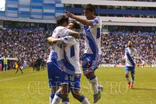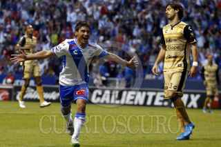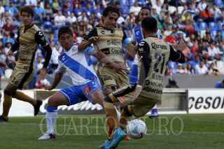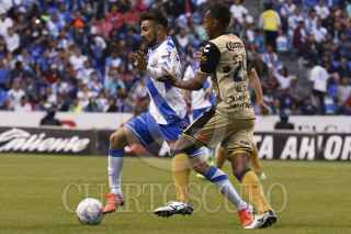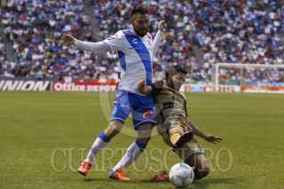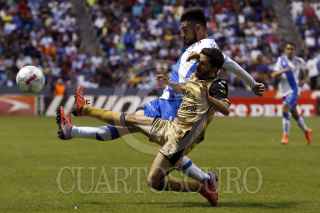 PUEBLA, PUEBLA., 21FEBRERO2016.- Los jugadores Matías Alustiza y Héctor Velázquez durante jugada del partido entre el Puebla de Franja y los Dorados de Sinaloa por la lucha directa por el no descenso correspondiente a la jornada 7 de la Liga BBVA Bancomer Mx Clausura 2016 en donde los camoteros dieron la vuelta al marcador que culminó 3-2 a favor de los locales. FOTO: HILDA RÍOS /CUARTOSCURO.COM