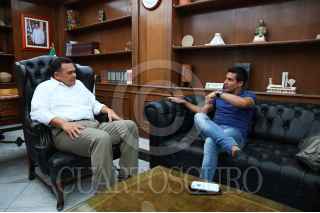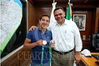 MÉRIDA, YUCATÁN, 27FEBRERO2016.- Rommel Pacheco medallista de oro en la prueba de trampolín de tres metros durante la Copa Mundial de Clavados celebrada recientemente en Río de Janeiro, Brasil se reunió esta mañana con el Gobernador Rolando Zapata Bello para compartir diversas anécdotas de la competencia que tuvo lugar en el país sudamericano que próximamente será sede de los Juegos Olímpicos. FOTO: FRANCISCO BALDERAS /CUARTOSCURO.COM