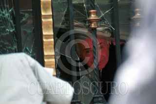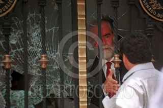 Un grupo de maestros arremetierón contra la puerta principal y camaras de seguridad , después un grupo de senadores entre ellos Diego Fenández de Cevallos presidente de la Mesa Directiva recibierón a una comisión. El Senado se comprometio como mediador ante el gobierno federal. FOTO: Pedro Mera/CUARTOSCURO.COM