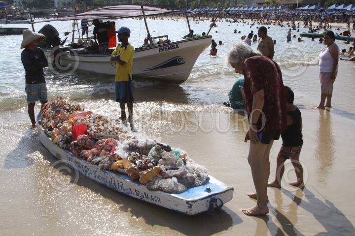 ACAPULCO, GUERRERO, 06MARZO2016.- Pescadores y comerciantes esperan a los turistas cque omienzan a llegar a las playas del puerto. Los paseantes pueden disfrutar de paseos a la Isla de la Roqueta y de platillos como mariscos y almejas recién sacados del mar. FOTO: BERNANDINO HERNÁNDEZ /CUARTOSCURO.COM