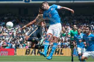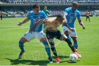 CIUDAD DE MÉXICO, 06MARZO2016.- El portero Jesús Corona, detiene el balón disparado por Eduardo Herrera durante el segundo tiempo del partido de Pumas contra Cruz Azul en el estadio Olímpico Universitario, que finalizó empatado a dos goles con anotaciones de Eduardo Herrera e Ismael Sosa de Pumas; Víctor Vázquez y Matías Vuoso de Cruz Azul. FOTO: DIEGO SIMÓN SÁNCHEZ /CUARTOSCURO.COM