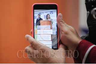 CIUDAD DE MÉXICO, 06MARZO2016.- Un celular inteligente transmite a traves de la aplicación Periscope, la conferencia de prensa de Mauricio Tabe Echartea, presidente del Partido Acción Nacional en la Ciudad de México y Xóchitl Gálvez Ruiz, jefa delegacional en Miguel Hidalgo, para hablar al respecto sobre el uso de las redes sociales en el servicio público. FOTO: DIEGO SIMÓN SÁNCHEZ /CUARTOSCURO.COM