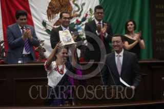 MORELIA, MICHOACÁN, 8MARZO2016.- María Guadalupe Hernández Dimas, recibió este martes la presea bañada en plata que entrega el Congreso del Estado por el Día Internacional de la Mujer, debido a su ardua labor en pro de los derechos de la mujer. Hernández Dimas originaria del municipio de Santa Fe de la Laguna ha recibido el Premio Nacional al Voluntariado, el Premio Eréndira y ha sido nominada al Premio Nobel de la Paz de manera colectiva con Mil Mujeres por el Mundo. La condecorada fue acompañada por una comitiva numerosa de mujeres importantes de su comunidad. FOTO: ALAN ORTEGA /CUARTOSCURO.COM