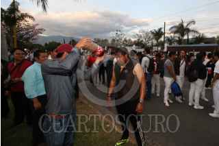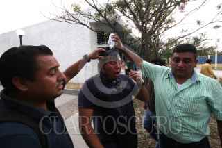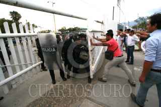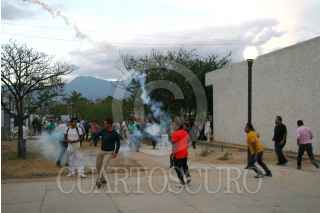 OAXACA, OAXACA., 08MARZO2016.- Catedráticos pertenecientes al Sindicato de Trabajadores y Académicos de la Universidad Autónoma Benito Juárez de Oaxaca (Stauo) acompañados por estudiantes de la facultad de Odontología reventaron la sesión extraordinaria del Consejo Universitario en la que se elegiría al consejo electoral el cual será el encargado del desarrollo del proceso electoral del próximo mes de mayo. Policías estatales intervinieron a solicitud del rector, Eduardo Martínez lo que ocasionó un pequeño enfrentamiento con los integrantes del Stauo lo que originó que los uniformados utilizarán gas lacrimógeno. FOTO: ARTURO PÉREZ ALFONSO /CUARTOSCURO.COM