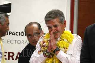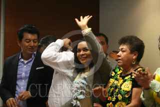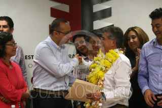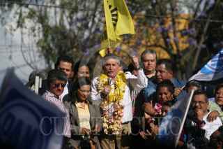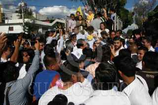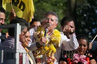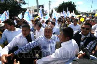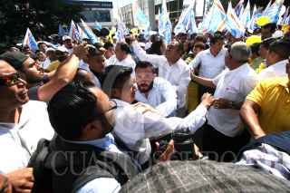 OAXACA, OAXACA., 11MARZO2016.- La tarde de este viernes José Estefan Garfias candidato de la coalición Con Rumbo y Estabilidad para Oaxaca (Creo) presentó ante el Instituto Estatal Electoral y de Participación Ciudadana de la entidad su registro formal como candidato a la gubernatura. Previo a este proceso Estefan Garfias realizó una caminata acompañado de la secretaría general del PRD a nivel nacional Beatriz Mojica, sin embargo hubo un momento que entre empujones, jalones y golpes el equipo de seguridad creó un cerco al rededor del candidato, dos reporteros gráficos fueron agredidos, tras lo cual se formó una doble valla para proteger a Estefan Garfias. FOTO: ARTURO PÉREZ ALFONSO /CUARTOSCURO.COM