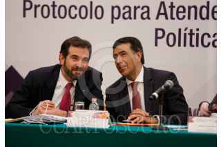 CIUDAD DE MÉXICO, 14MARZO2016.- El consejero presidente del INE Lorenzo Córdova Vianello, y el magistrado Presidente del TEPJF Constancio Carrasco Daza, durante la presentación del Protocolo para atender la Violencia Política contra las mujeres, en las instalaciones del Tribunal Electoral del Poder Judicial de la Federación. FOTO: INE /CUARTOSCURO.COM