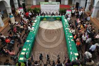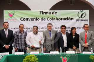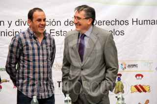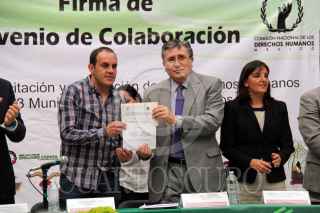 CUERNAVACA, MORELOS, 15MARZO2016.- En las instalaciones del Museo de la Ciudad se llevó a cabo la Firma de convenio de colaboración en materia de capacitación y divulgación de los Derechos Humanos con los 33 municipios del Estado de Morelos. Dicho evento fue encabezado por Luis Raúl González Pérez, presidente de la Comisión Nacional de Derechos Humanos, entre los alcaldes que asistieron se encontraba Cuauhtémoc Blanco de Cuernavaca y de Jiutepec Manuel Agüero. FOTO: PATRICIA MORALES / CUARTOSCURO.COM