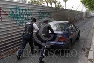 GUADALAJARA, JALISCO. 16MARZO2016.- Dos agentes viales prestan el apoyo a una persona la cual su automóvil dejo de funcionar y para no obstruir el trafico que ya es cotidiano por la obras que se realizan en ese punto los servidores públicos lo arrempujaron hasta otro lugar, esto en Av. Alcalde casi esquina con Ávila Camacho. FOTO : FERNANDO CARRANZA GARCIA / CUARTOSCURO.COM