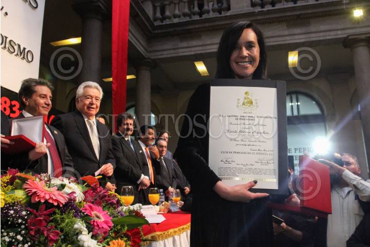 CIUDAD DE MÉXICO, 16MARZO2016.- Isaura Fuentes García, cartonista, premiada con Mención Honorífica, en el Premio Nacional de Periodismo. Olegario Vázquez Raña, presidente del Grupo Ángeles, y Moris Sallloum, presidente del Club de Periodistas, encabezaron la entrega del Premio Nacional e Internacional de Periodismo en el recinto localizado en el Centro Histórico. En el discurso inaugural mencionaron la fuerte crisis de desaparición forzada que padece el país. FOTO: MARÍA JOSÉ MARTÍNEZ /CUARTOSCURO.COM
