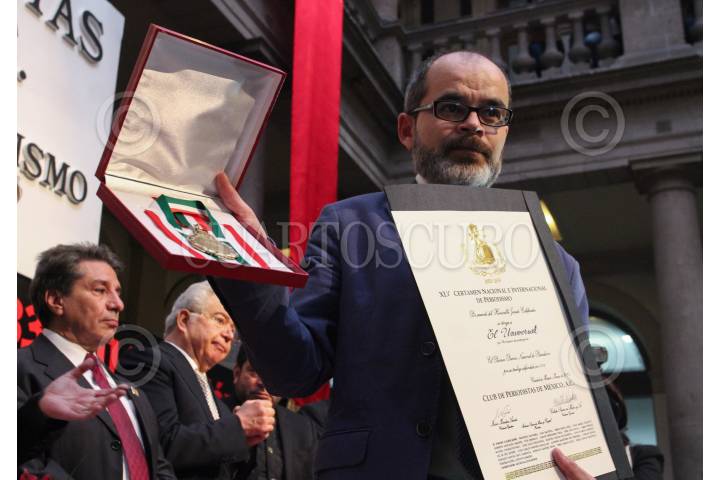 CIUDAD DE MÉXICO, 16MARZO2016.- Isaura Fuentes García, cartonista, premiada con Mención Honorífica, en el Premio Nacional de Periodismo. Olegario Vázquez Raña, presidente del Grupo Ángeles, y Moris Sallloum, presidente del Club de Periodistas, encabezaron la entrega del Premio Nacional e Internacional de Periodismo en el recinto localizado en el Centro Histórico. En el discurso inaugural mencionaron la fuerte crisis de desaparición forzada que padece el país. FOTO: MARÍA JOSÉ MARTÍNEZ /CUARTOSCURO.COM