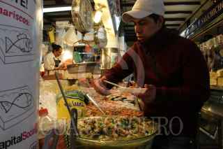 CIDUAD DE MÉXICO, 19MARZO2016.- Pescados y mariscos se ofertan en el Mercado San Juan; esta es una de las temporadas más activas en consumo por los días de Cuaresma. La Pescadería Eladio en el local 84, negocio familiar comandado por la familia Villeda desde hace 55 años, es uno de los favoritos entre los comensales para consumir ceviche y pescado fresco para llevar. FOTO: MARÍA JOSÉ MARTÍNEZ /CUARTOSCURO.COM