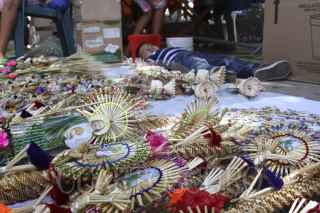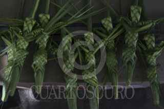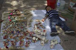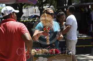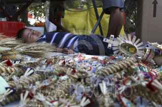 ACAPULCO, GUERRERO, 19MARZO2016.- Habitantes de poblados cercanos al puerto llegan a este destino turístico para vender las palmitas que se utilizan en la celebración católica de Domingo de Ramo. Los comerciantes se colocan en las inmediaciones de la catedral, tal es el caso de doña Mar que se acompaña de su pequeño hijo, quien duerme una siesta entre las palmitas. FOTO: BERNANDINO HERNÁNDEZ /CUARTOSCURO.COM