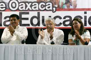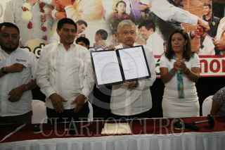 OAXACA, OAXACA, 21MARZO2016.- El presidente del partido Movimiento de Regeneración Nacional (Morena), Andrés Manuel López Obrador firmó este lunes un acuerdo con profesores pertenecientes a la sección 22 de la Coordinadora Nacional de los Trabajadores de la Educación (CNTE), el cual también fue firmado por el candidato a la gubernatura, Salomón Jara y maestros, en este se compromete que de ganar las elecciones del próximo mes de junio iniciará una serie de cambios en la administración estatal en beneficio de la educación. Entre estos compromisos señala que se creará la Secretaría de Educación Pública cuyo titular será elegido de una terna propuesta por el magisterio democrático, además de la presentación y aprobación de una Ley Estatal de Educación basada en el Plan para la Transformación de la Educación de Oaxaca (PTEO) . FOTO: ARTURO PÉREZ ALFONSO /CUARTOSCURO.COM