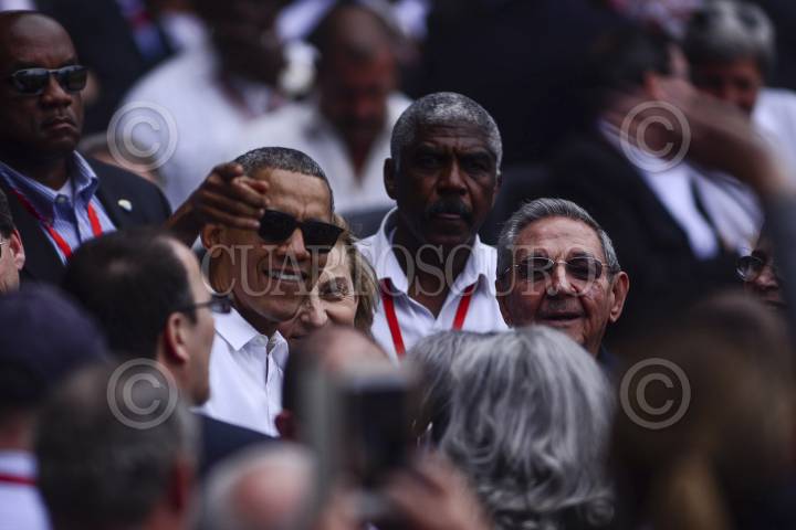 LA HABANA, CUBA, 22MARZO2016.- Barack Obama, presidente de los Estados Unidos y Raúl Castro, presidente de Cuba, durante el partido de béisbol entre los Rays Tampabay y la selección de Cuba, como parte de las actividades para restablecer las actividades diplomáticas entre la isla y los norteamericanos. FOTO: ADOLFO VLADIMIR /CUARTOSCURO.COM