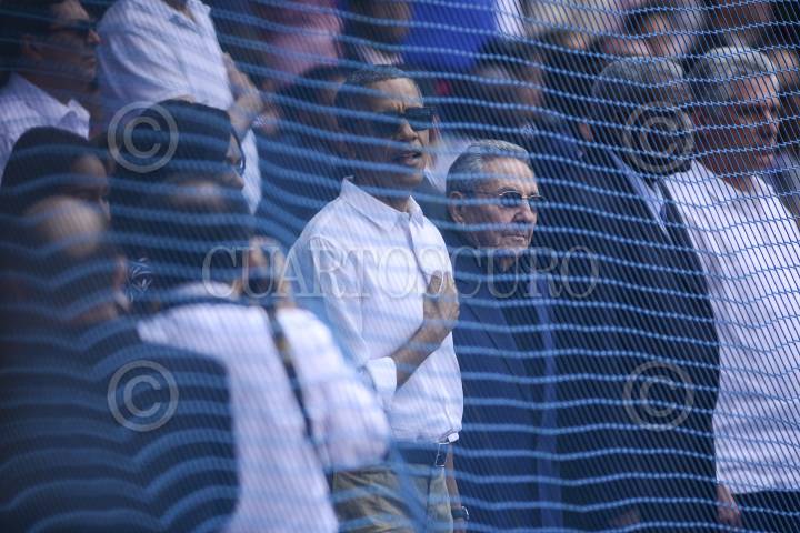LA HABANA, CUBA, 22MARZO2016.- Barack Obama, presidente de los Estados Unidos y Raúl Castro, presidente de Cuba, durante el partido de béisbol entre los Rays Tampabay y la selección de Cuba, como parte de las actividades para restablecer las actividades diplomáticas entre la isla y los norteamericanos. FOTO: ADOLFO VLADIMIR /CUARTOSCURO.COM