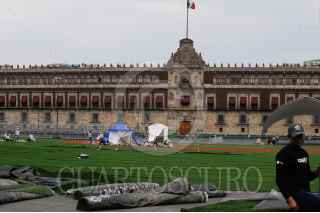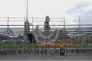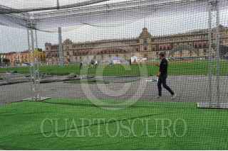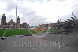 CIUDAD DE MÉXICO, 23MARZO2016.- Trabajadores de la CDMX continúan en el zócalo la construcción del campo de béisbol que se utilizará para el Home Run Derby, el viernes se prevé una clínica para dos mil niños de las diferentes ligas infantiles de béisbol. Sábado y domingo estarán jugadores de Padres de San Diego y Astros de Houston, quienes disputarán un encuentro en pleno corazón de la capital. FOTO: ARMANDO MONROY /CUARTOSCURO.COM