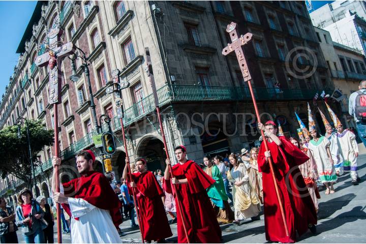 CIUDAD DE MÉXICO, 25MARZO2016.- Un grupo de actores, pertenecientes a la Compañía Nacional de Teatro Clásico “Fénix Novohispano”, realizaron la representación de la Pasión de Cristo en el primer cuadro del Centro Histórico de la Ciudad de México, la característica principal de la puesta en escena fue el vestuario y los accesorios, que evocaron el vía crucis que se realizaba en el siglo XVI afuera de la catedral metropolitana. FOTO: DIEGO SIMÓN SÁNCHEZ /CUARTOSCURO.COM