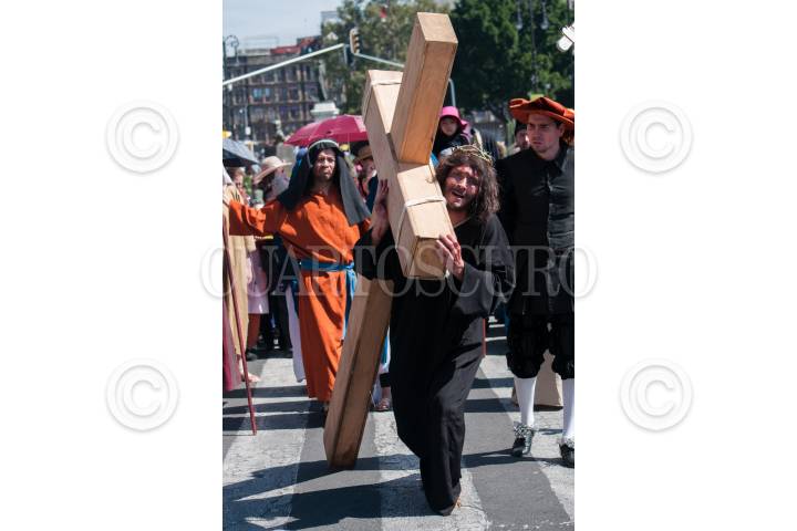 CIUDAD DE MÉXICO, 25MARZO2016.- Un grupo de actores, pertenecientes a la Compañía Nacional de Teatro Clásico “Fénix Novohispano”, realizaron la representación de la Pasión de Cristo en el primer cuadro del Centro Histórico de la Ciudad de México, la característica principal de la puesta en escena fue el vestuario y los accesorios, que evocaron el vía crucis que se realizaba en el siglo XVI afuera de la catedral metropolitana. FOTO: DIEGO SIMÓN SÁNCHEZ /CUARTOSCURO.COM
