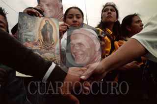 Imágenes alusivas a las anteriores visitas del Papa Juan Pablo II, y al beato Juan Diego, fueron las preferidas por los fieles que esperaron desde tempranas horas el paso del "papamóvil". FOTO: Juan Sotelo/CUARTOSCURO.COM