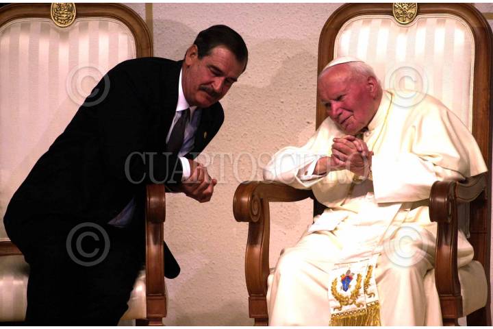 Lino Korrodi, ex coordinador de finanzas de "Amigos de Fox", y Carlos Medina Plascencia, diputado federal panista, también acudieron al hangar presidencial para dar la bienvenida al Papa Juan Pablo II. FOTO: Pedro Mera/CUARTOSCURO.COM