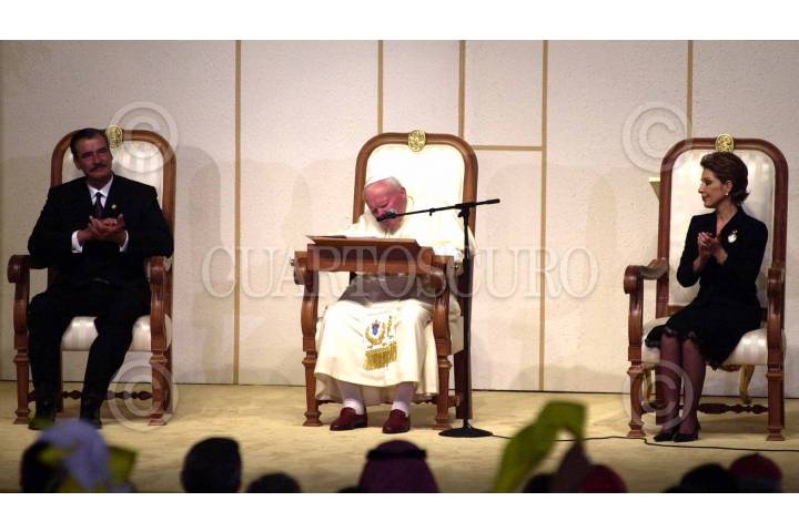 Lino Korrodi, ex coordinador de finanzas de "Amigos de Fox", y Carlos Medina Plascencia, diputado federal panista, también acudieron al hangar presidencial para dar la bienvenida al Papa Juan Pablo II. FOTO: Pedro Mera/CUARTOSCURO.COM