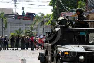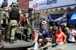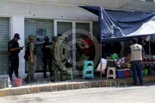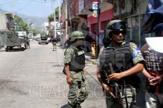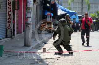 ACAPULCO, GUERRERO, 26MARZO2016.- Hombres desconocidos lanzaron una granada que no explotó contra el sitio de taxis en la colonia Las Cruces, sobre la calle Futbol, a unos metros del área de carga y descarga del centro comercial Bodega Aurrerá, en la periferia de Acapulco. Al lugar acudieron elementos del Ejército Mexicano para acordonar el área y retirar el artefacto mediante herramientas especiales y equipos antibombas, ante la mirada atónita de transeúntes. En un punto cercano murió un hombre por impacto de bala mientras desayunaba en una fonda de Las Cruces, y dos más resultaron heridos, en lo que presuntamente se trató de otro ataque a un sitio de taxistas que laboran en los alrededores del mercado de Las Cruces. De acuerdo a versiones, una bala perdida de hombres que se perseguían terminó con la vida del comensal. En otro hecho, un hombre asesinado aparentemente a golpes fue encontrado en la colonia Miguel Alemán. Desde que inició el periodo vacacional de Semana Santa, el domingo pasado, al menos 38 personas han muerto en hechos violentos en Acapulco y tres más en Coyuca de Benítez. FOTO: BERNANDINO HERNÁNDEZ /CUARTOSCURO.COM