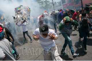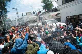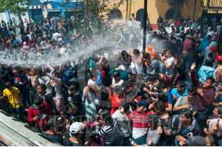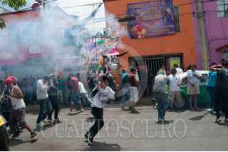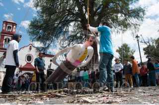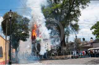CIUDAD MÉXICO, 27MARZO2016.- Vecinos del barrio la Asunción de la delegación Xochimilco, participaron en la quema de los tradicionales judas y toritos, en la explanada de la parroquia. Jóvenes en su mayoría, son los que desafían bailando y sorteando brincos entre los cohetes que salen disparados por doquier; si algo sale mal, pipas con agua potable esperan para apagar las llamas, y si el calor es insoportable, los asistentes son bañados con agua para mitigar el calor. FOTO: DIEGO SIMÓN SÁNCHEZ /CUARTOSCURO.COM