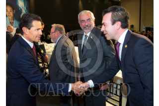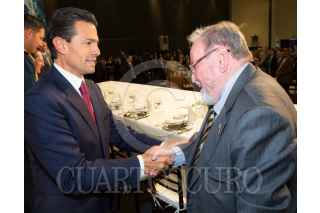 CIUDAD DE MÉXICO, 29MARZO2016.- El Presidente de la República, Enrique Peña Nieto, encabezó la 35ª Asamblea General Ordinaria de la Fundación Mexicana para la Salud, donde aseguró que la salud es una condición indispensable para el ejercicio de los demás derechos y libertades, y es el bien más preciado, la base del desarrollo individual, y lo que permite que mujeres y hombres puedan crecer, estudiar, trabajar, tener una vida plena y disfrutarla en compañía de sus seres queridos. En la imagen Enrique Peña Nieta saluda al ex rector de la UNAM Guillermo Soberón Acevedo. FOTO: PRESIDENCIA /CUARTOSCURO.COM
