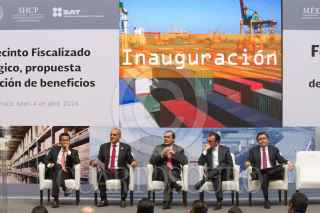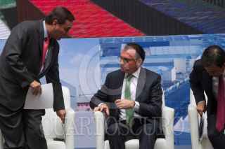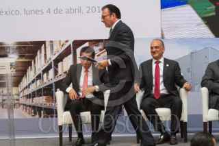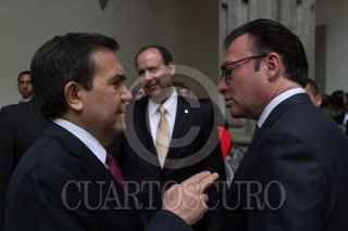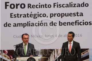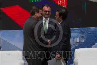CIUDAD DE MÉXICO, 04ABRIL2016.- Ildefonso Guajardo, secretario de Economía, y Luis Videgaray Caso, secretario de Hacienda y Crédito Público (SHCP), durante la inauguración del foro "Recinto Fiscalizado Estratégico, propuesta de ampliación de beneficios", en el patio del Museo Interactivo de Economía. FOTO: MOISÉS PABLO /CUARTOSCURO.COM