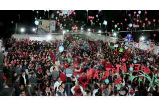 TLACALA, TLAXCALA, 04ABRIL2016.- Al inicio de su mensaje, Marco Mena, candidato del PRI, aseguró que va a ganar la gubernatura de Tlaxcala. Su discurso recurre, al igual que lo hizo el día de su registro, a los 500 años de antigüedad de nuestro estado. La llegada de una cantidad mayor de simpatizantes, aproximadamente mil personas, originó la improvisación en este evento. Los problemas de logística no se hicieron esperar, su equipo no estaba preparado para recibir a tanta gente, sólo se pudo ver al candidato a través de una pantalla improvisada. FOTO: JORGE LEZAMA /CUARTOSCURO.COM