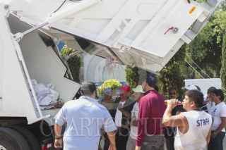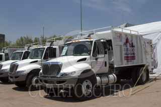 CIUDAD DE MÉXICO, 05ABRIL2016.- Entregaron cinco camiones recolectores de basura en la delegación Cuauhtémoc. En ceremonia encabezada el jefe de la demarcación Ricardo Monreal señalo que continuará con la renovación de estas unidades para contrarrestar la contaminación, propia de las unidades viajes. FOTO: MOISÉS PABLO /CUARTOSCURO.COM