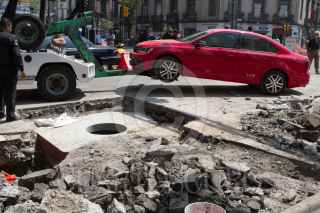 CIUDAD DE MÉXICO, 07ABRIL2016.- Por obras de la Comisión federal de Electricidad en la calle de Tolsa casi esquina con Bucareli, en la colonia Juarez, un vehículo cayo en un hoyo de los cientos que han hecho la llamada "empresa de clase mundial", en su remodelación de la red eléctrica. FOTO: MOISÉS PABLO /CUARTOSCURO.COM