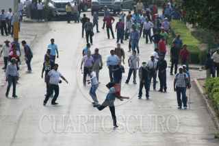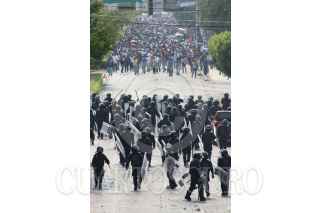 TUXTLA GUTIERREZ, CHIAPAS, 15ABRIL2016.- Maestros de la Coordinadora Nacional de Trabajadores de la Educación (CNTE), realizaron una serie de protestas en la capital, pretendían el bloqueo de varias carreteras cuando fueron repelidos por Policías Federales, durante la jornada los mentores quemaron el carro de una reportera que cubría el evento. FOTO: JACOB GARCIA /CUARTOSCURO.COM
