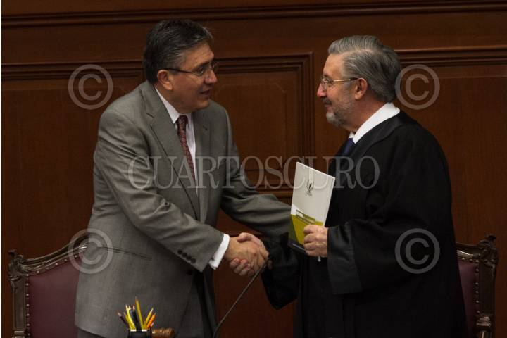 CIUDAD DE MÉXICO, 19ABRIL2016.- Luis Raúl González Pérez, presidente de la Comisión Nacional de Derechos Humanos (CNDH), entregó su informe anual de actividades 2015 ante el pleno de la Suprema Corte de Justicia de la Nación. El documento lo recibió el ministro presidente Luis María Aguilar Morales. FOTO: MOISÉS PABLO /CUARTOSCURO.COM