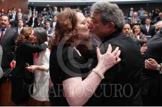 CIUDAD DE MÉXICO, 21ABRIL2016.- El político Emilio Rabasa, después tomar protesta como cónsul en Boston, recibió un beso de su esposa Maricarmen Alanis, magistrada del Tribunal Electoral. FOTO: CUARTOSCURO.COM