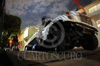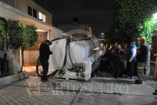 CIUDAD DE MÉXICO, 22ABRIL2016.- A causa del hundimiento de tierra por una fuga de agua en la calle Privada A del pueblo de Culhuacán, una pipa que transportaba agua potable para abastecer dicha colonia, se hundió del eje trasero, al quebrarse el concreto que sostenía el piso firme de esta calle. Bomberos y protección civil, laboraron en este lugar por casi 9 horas para retirar el pesado vehículo. FOTO: LUIS CARBAYO /CUARTOSCURO.COM