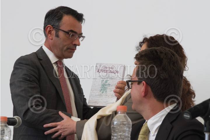 CIUDAD DE MÉXICO, 24ABRIL2016.- Alejandro Valencia, Ángela Buitrago y Francisco Cox, integrantes del Grupo Interdisciplinario de Expertos Independientes (GIEI), recogen sus cosas al terminar la conferencia de prensa en la cual dieron a concocer las conclusiones del segundo informe de las investigaciones de la desaparición de los 43 normalistas de Ayotzinapa, secuestrados la noche del 26 de septiembre de 2014, en Iguala, Guerrero. FOTO: MOISÉS PABLO /CUARTOSCURO.COM