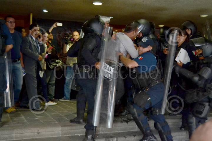 MORELIA, MICHOACÁN, 27ABRIL2016.- Durante la visita de Aurelio Nuño, secretario de Educación Pública, maestros de la sección 18 de la Coordinadora Nacional de Trabajadores de la Educación (CNTE) se enfrentaron con policías antimotines en el Centro de Convenciones y Exposiciones (Ceconexpo), los inconforme que calificaron la visita de ser una provocación lanzaron piedras y rompieron vidrios, 44 personas fueron detenidos, entre normalistas y maestros. FOTO: HÉCTOR SÁNCHEZ /CAMBIO DE MICHOACÁN/CUARTOSCURO.COM