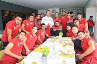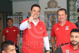 ZACATECAS, ZACATECAS, 28ABRIL2016.- Alejandro Tello Cristerna, candidato de la Alianza Zacatecas Primero, deseó el mejor de los éxitos al equipo de todos, Mineros de Zacatecas, quienes enfrentarán este jueves a los Leones Negros de la Universidad de Guadalajara. "Sé que vamos a ganar, somos un equipo triunfador y estoy convencido de que llegaremos a la final", dijo el abanderado del PRI-PVEM-PANAL a los jugadores de Mineros, a quienes saludó durante la concentración, horas antes de su encuentro de la etapa semifinal del circuito de ascenso del Fútbol Mexicano. FOTO: CUARTOSCURO.COM